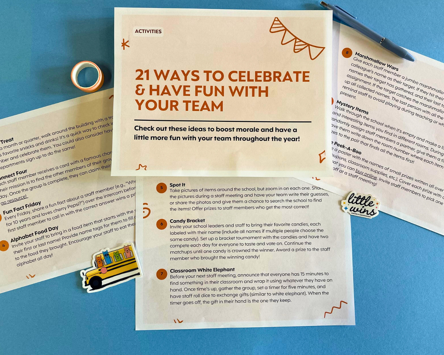Having fun as a team at school breaks the routine, reduces stress, and creates a positive atmosphere where both staff and students feel valued and motivated. Plan a few fun activities for your staff (and students) from our list of low-cost, high-reward ideas that will spark creativity, teamwork, and celebrate your team!