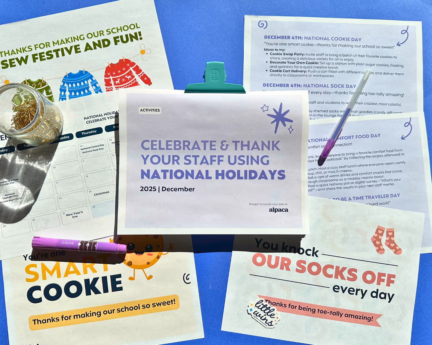 Celebrating together boosts morale and reinforces a supportive work environment by reminding staff of their value within the school community. Try out the holidays and ideas we've put together to make your staff feel special and appreciated throughout the year!