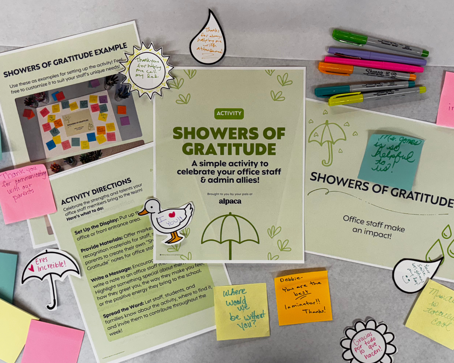 School leaders set up a “Showers of Gratitude” display where staff, students, or families write appreciation notes and add them to the board throughout the week. The resource includes printable signs, gratitude templates, example displays, and activity variations to make celebrating staff simple and visible.
